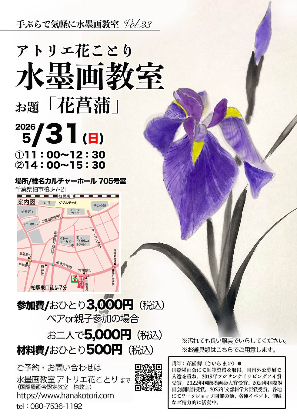5/31(日)柏で開催、水墨画教室。お題は「花菖蒲」です。